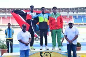 SILVER START: Trinidad and Tobago’s Dorian Charles, left, celebrates his Boys’ Under-20 javelin silver on the opening day of the 2023 Carifta Games in Nassau, Bahamas, yesterday. Charles threw 61.58 metres.ÊBahamian Kaden Cartwright, centre, struck gold, with a big 64.07 effort. Grenadian Cameron Thomas (60.12), right, bagged bronze. – Photo: PAUL VOISIN